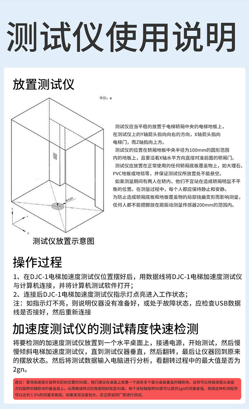 DJC-1電梯加速度測試儀主要用于記錄電梯的啟動、制動及運行過程中的加速度及振動性能,該儀器操作簡單,可按照以下程序進行。
